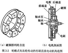輪轂式有齒輪傳動的有刷直流電機,由盤形電樞有刷電機和齒輪減速兼傳動系統兩部分構成。盤形電樞是高速轉動的轉子。輪毅式有齒輪傳動的有刷直流電機的構造如圖2-2所示。電機的轉矩通過軸傳遞給第一級齒輪,經齒輪減速帶動輪轂外殼轉動。