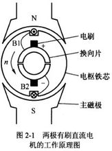 圖2-1所示的兩極有刷直流電機的固定部分(定子)上裝設了一對直流勵磁的靜止的主磁極N和S,在旋轉部分(轉子)上裝設電樞鐵芯。定子與轉子之間有一氣隙。在電樞鐵芯上放置了由A和X兩根導體連成的電樞線圈,線圈的首端和末端分別連到兩個圓弧形的銅片上,此銅片稱為換向片。換向片之間互相絕緣,由換向片構成的整體稱為換向器。換向器固定在轉軸上,換向片與轉軸之間亦互相絕緣。在換向片上放置著一對固定不動的電刷B1和B2,當電樞旋轉時,電樞線圈通過換向片和電刷與外電路接通。