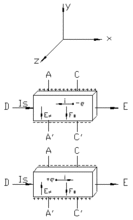 磁場中有一個霍爾半導體片,恒定電流I從A到B通過該片。在洛侖茲力的作用下,I的電子流在通過霍爾半導體時向一側偏移,使該片在CD方向上產生電位差,這就是所謂的霍爾電壓。