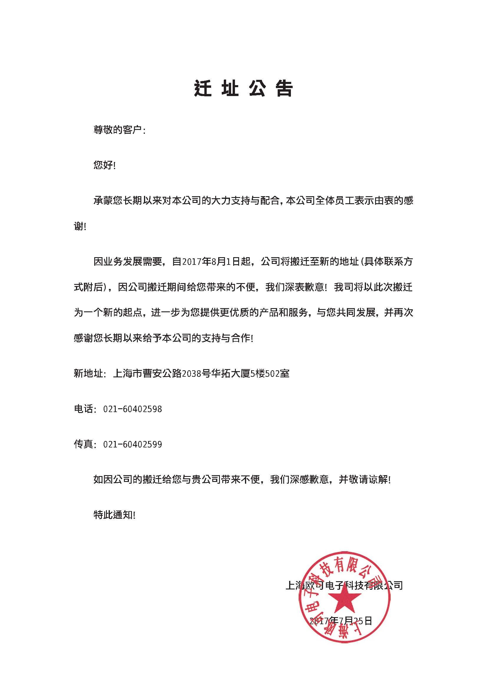 因業(yè)務(wù)發(fā)展需要,自2017年8月1日起,公司將搬遷至新的地址(具體聯(lián)系方式附后),因公司搬遷期間給您帶來的不便,我們深表歉意!...